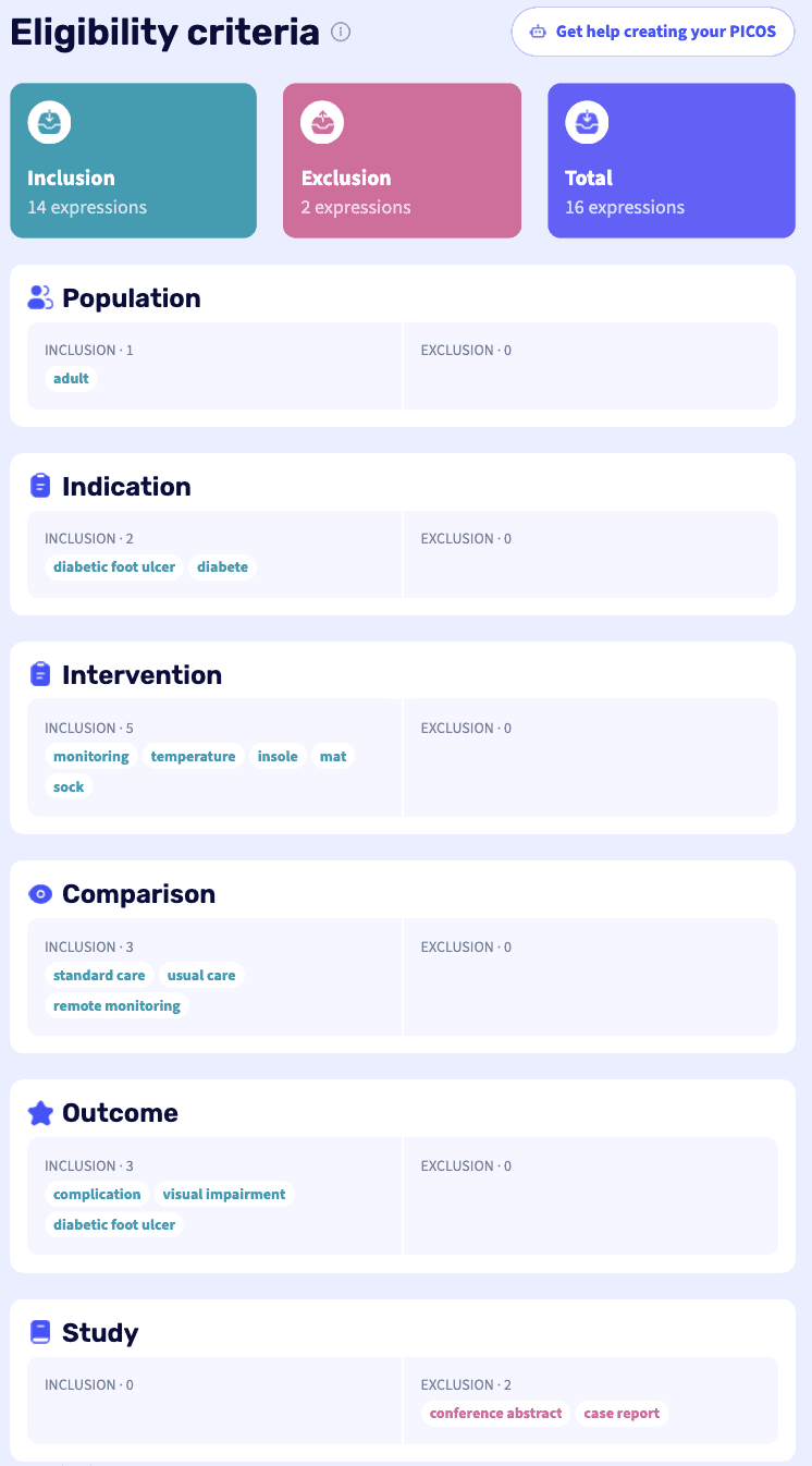 À partir des éléments définis ci-dessus (Population, Intervention, Comparateur, Outcome, Study), NOÉ permet de structurer les critères d’éligibilité pour la revue systématique de manière claire et visuelle.